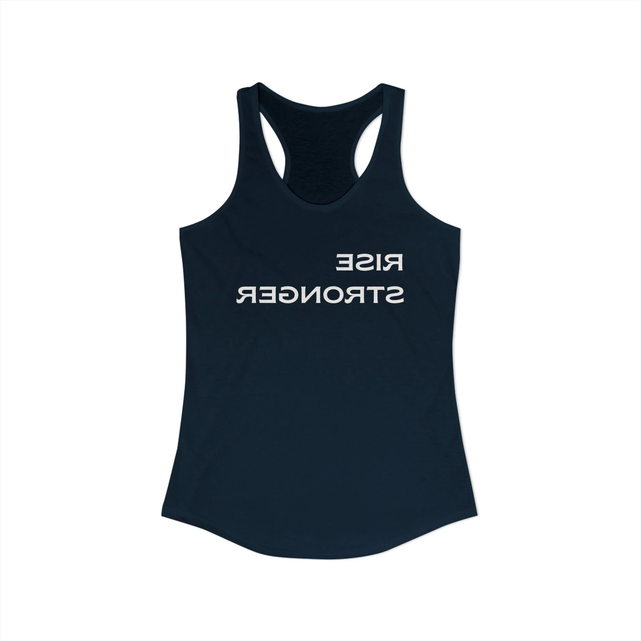 The Rise Stronger tank is designed to be read in the mirror mid-workout, anchoring you back into your body so you can continue with focus and control.